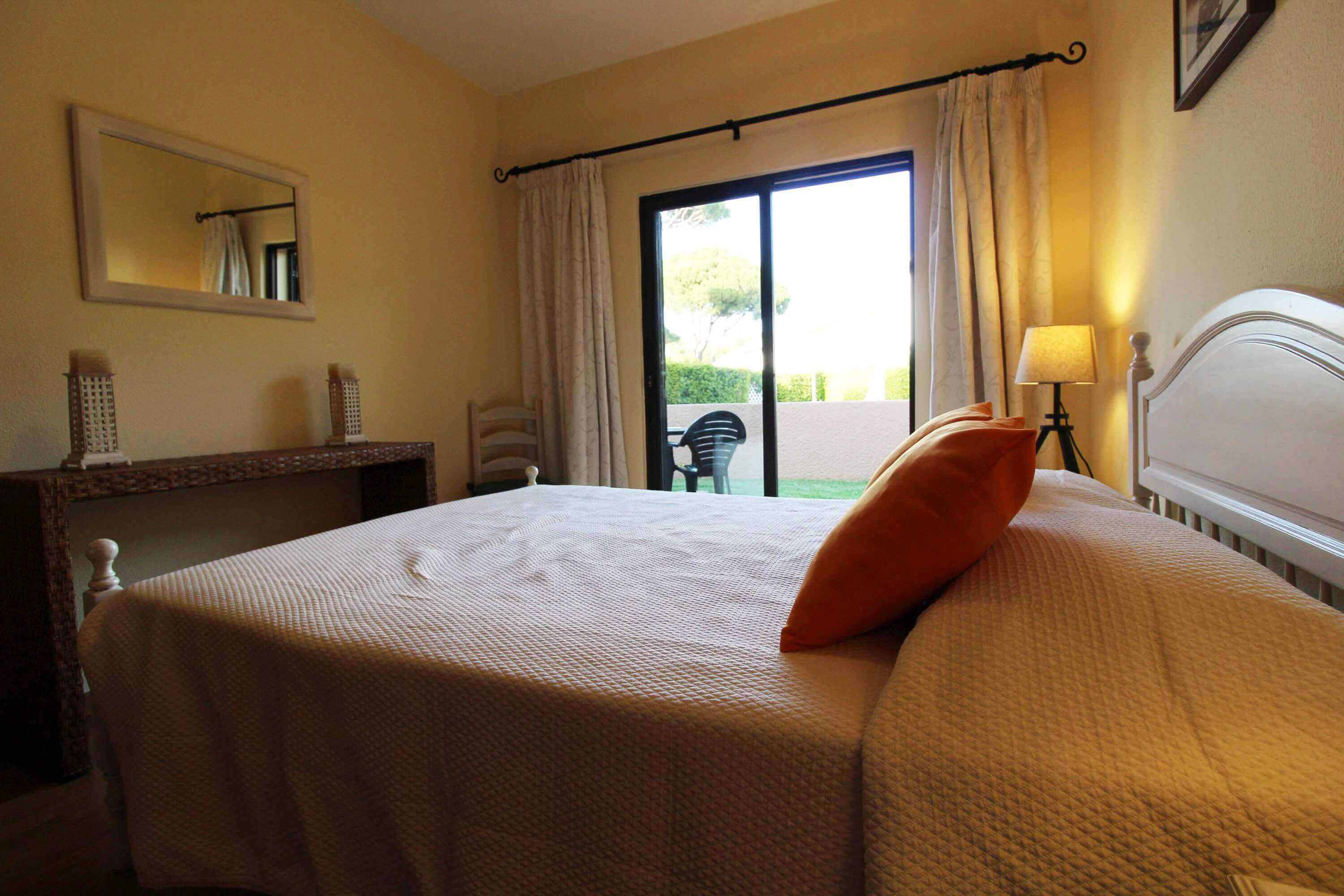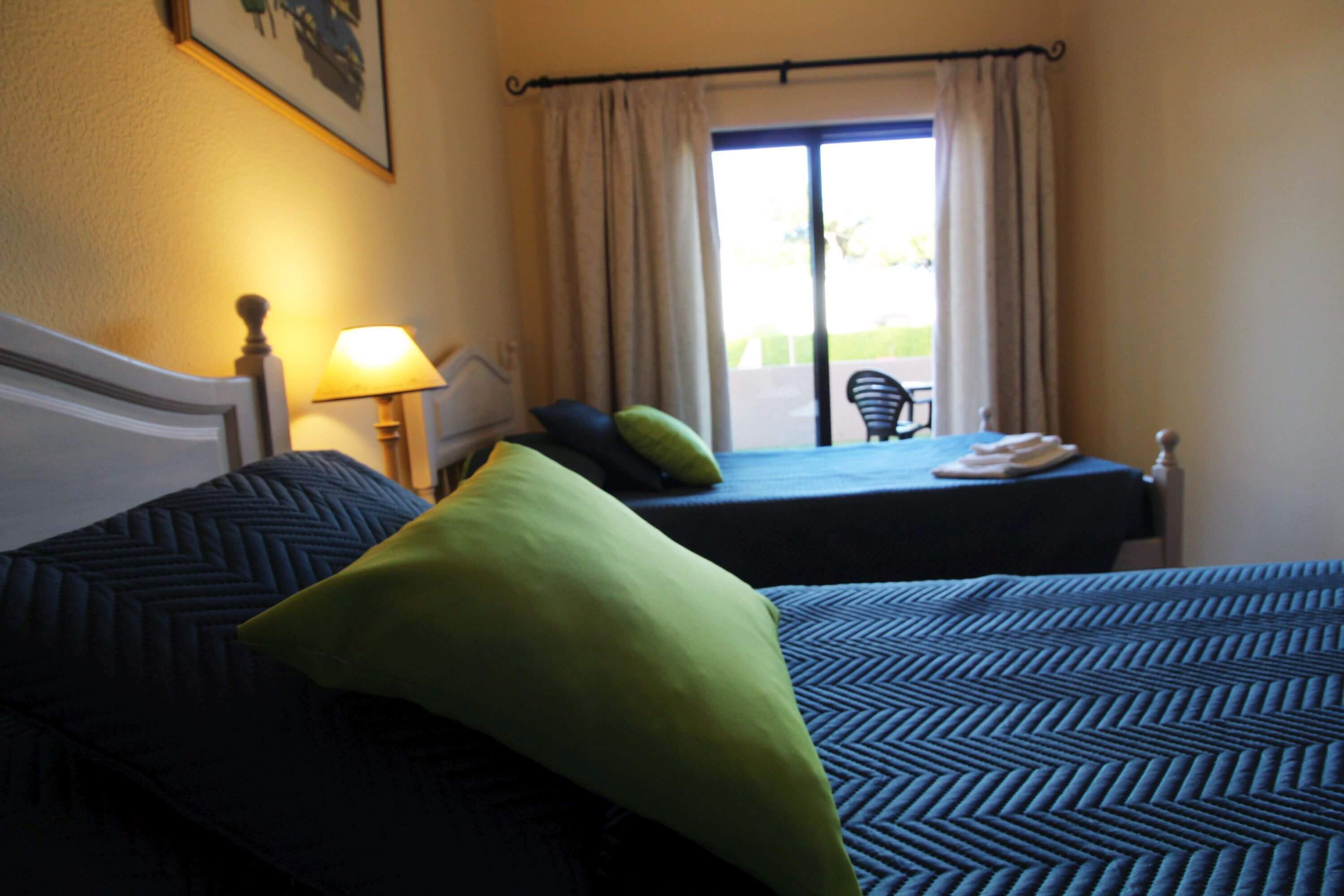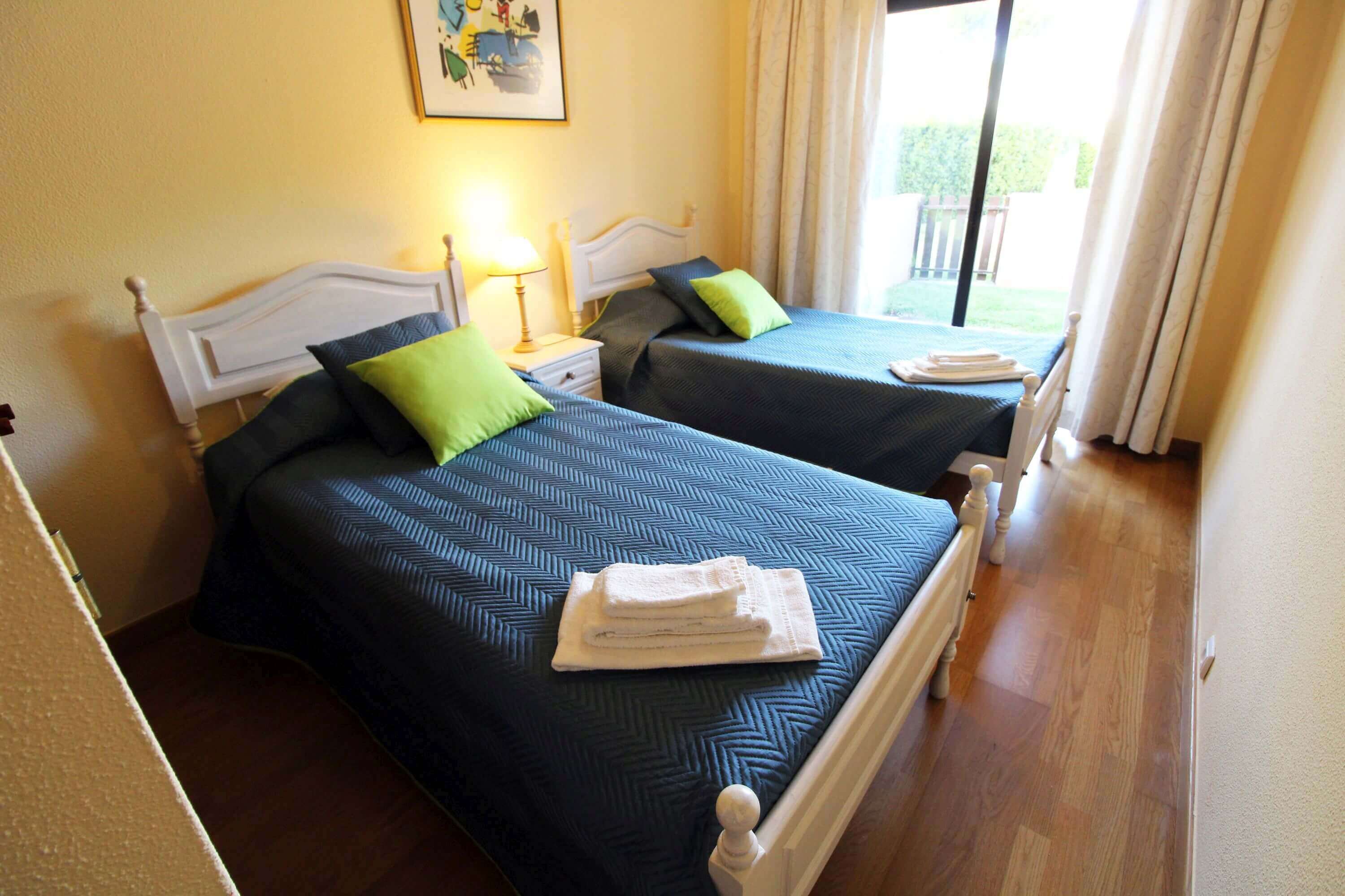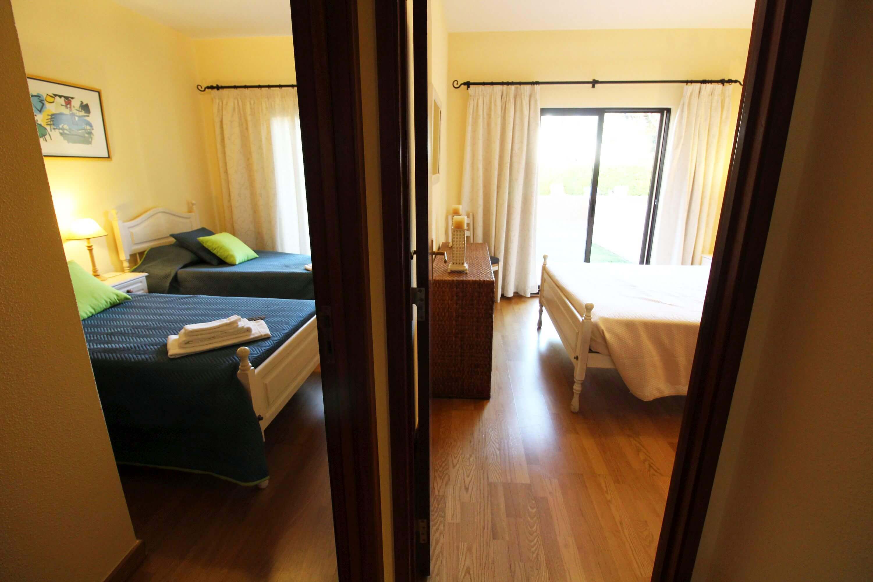 There's one bedroom with 2 single beds, and another bedroom with a double bed, both with direct access to a patio, which gives access to the communal pool. There's a bathroom with a shower available.