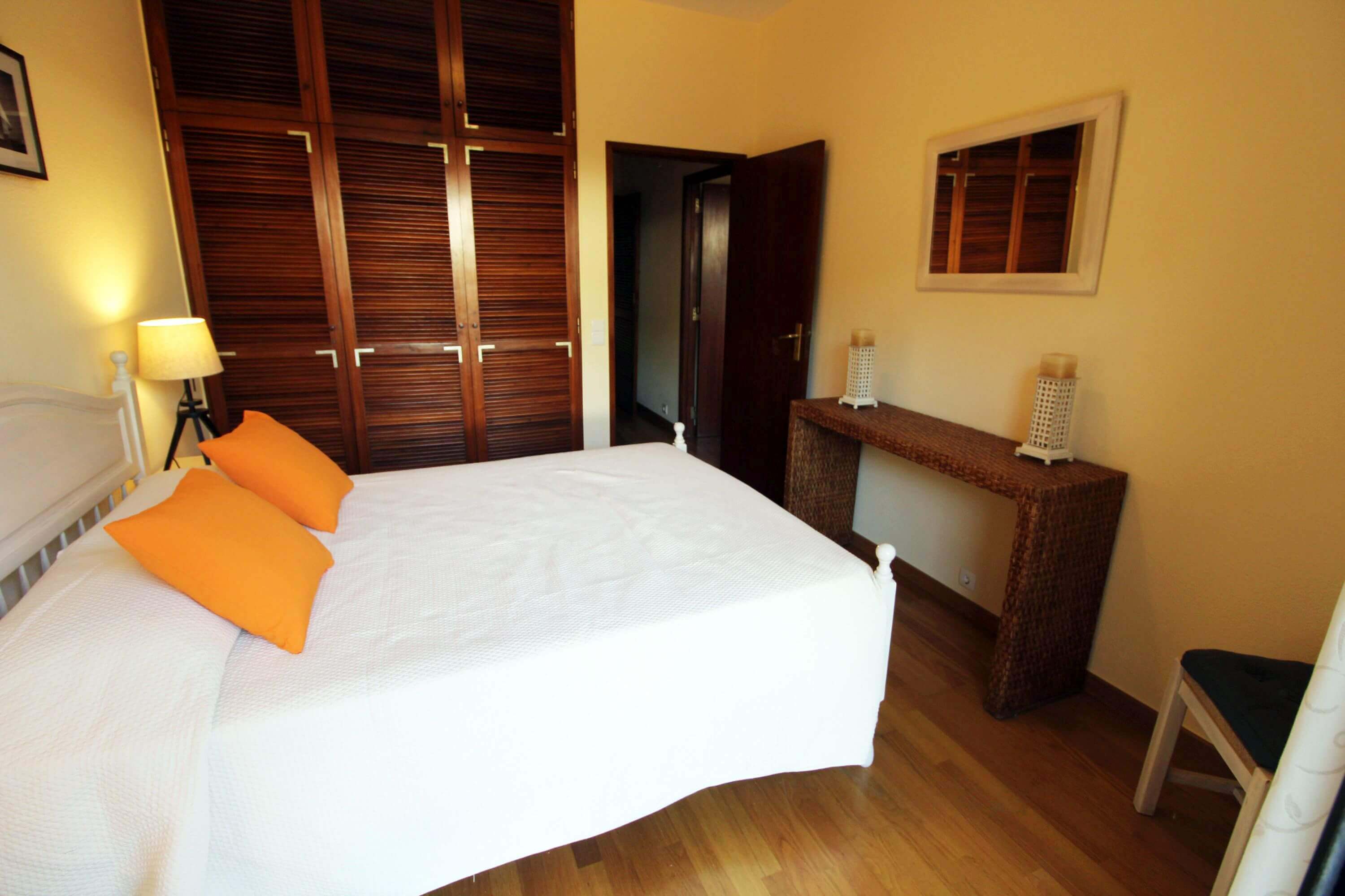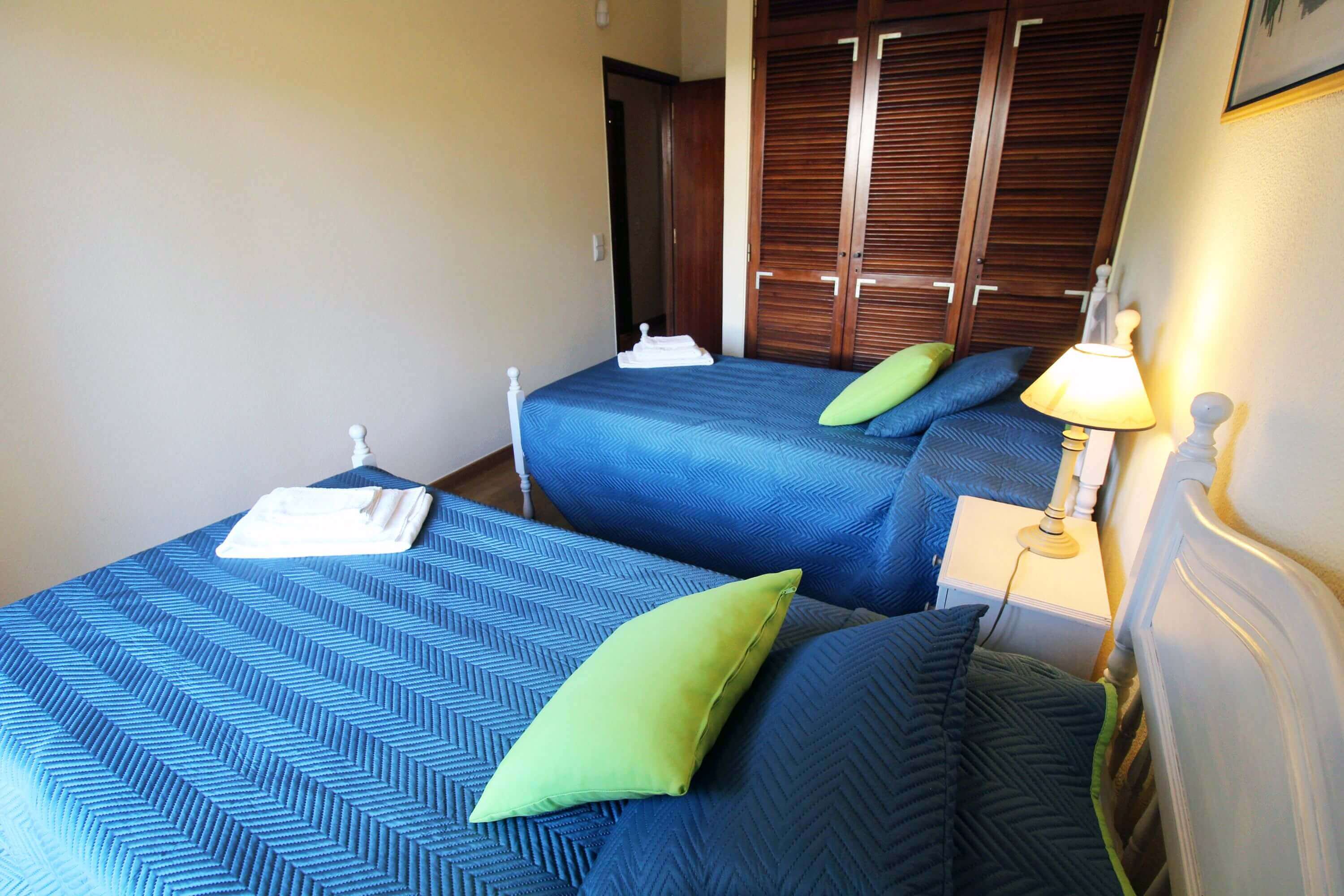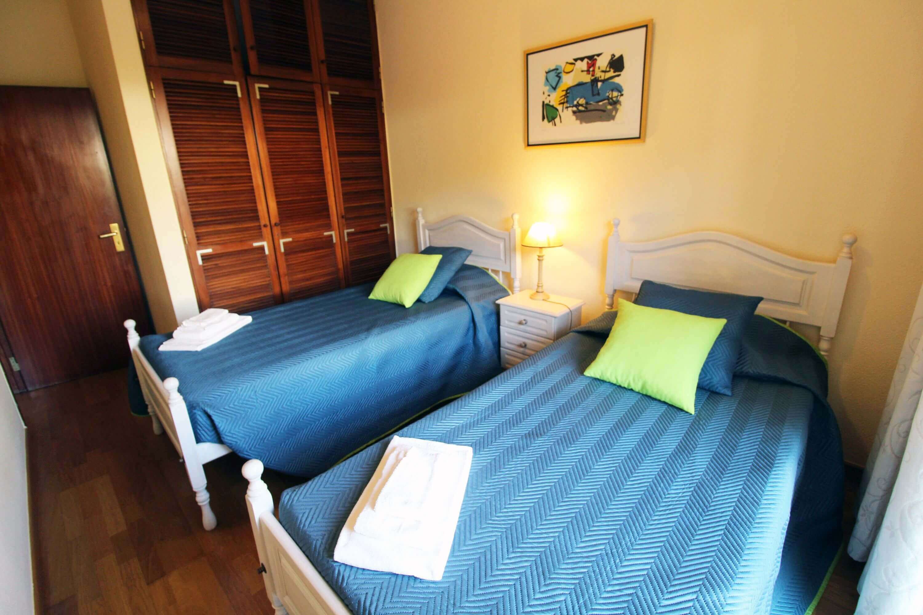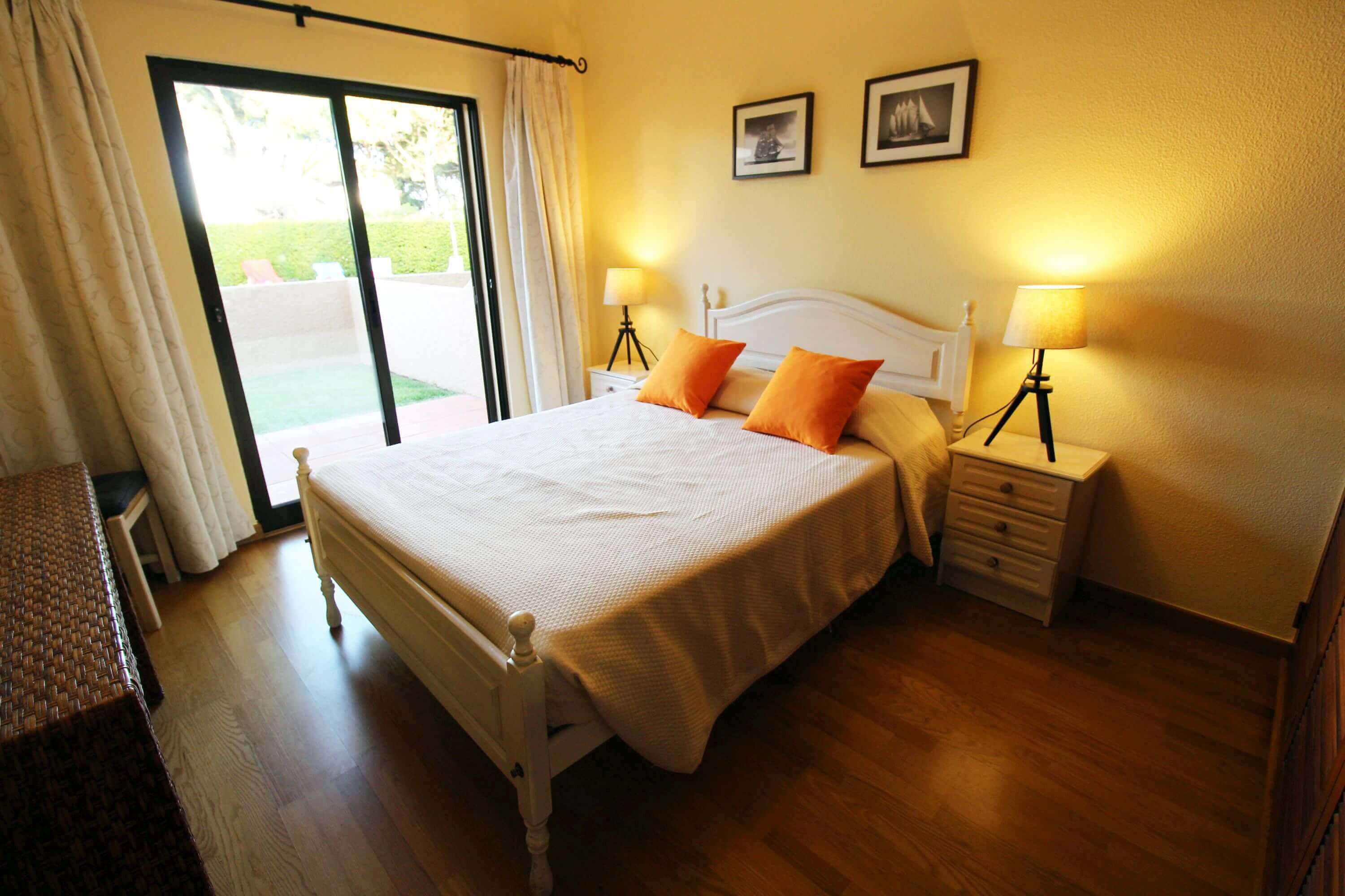 There's one bedroom with 2 single beds, and another bedroom with a double bed, both with direct access to a patio, which gives access to the communal pool. There's a bathroom with a shower available.
