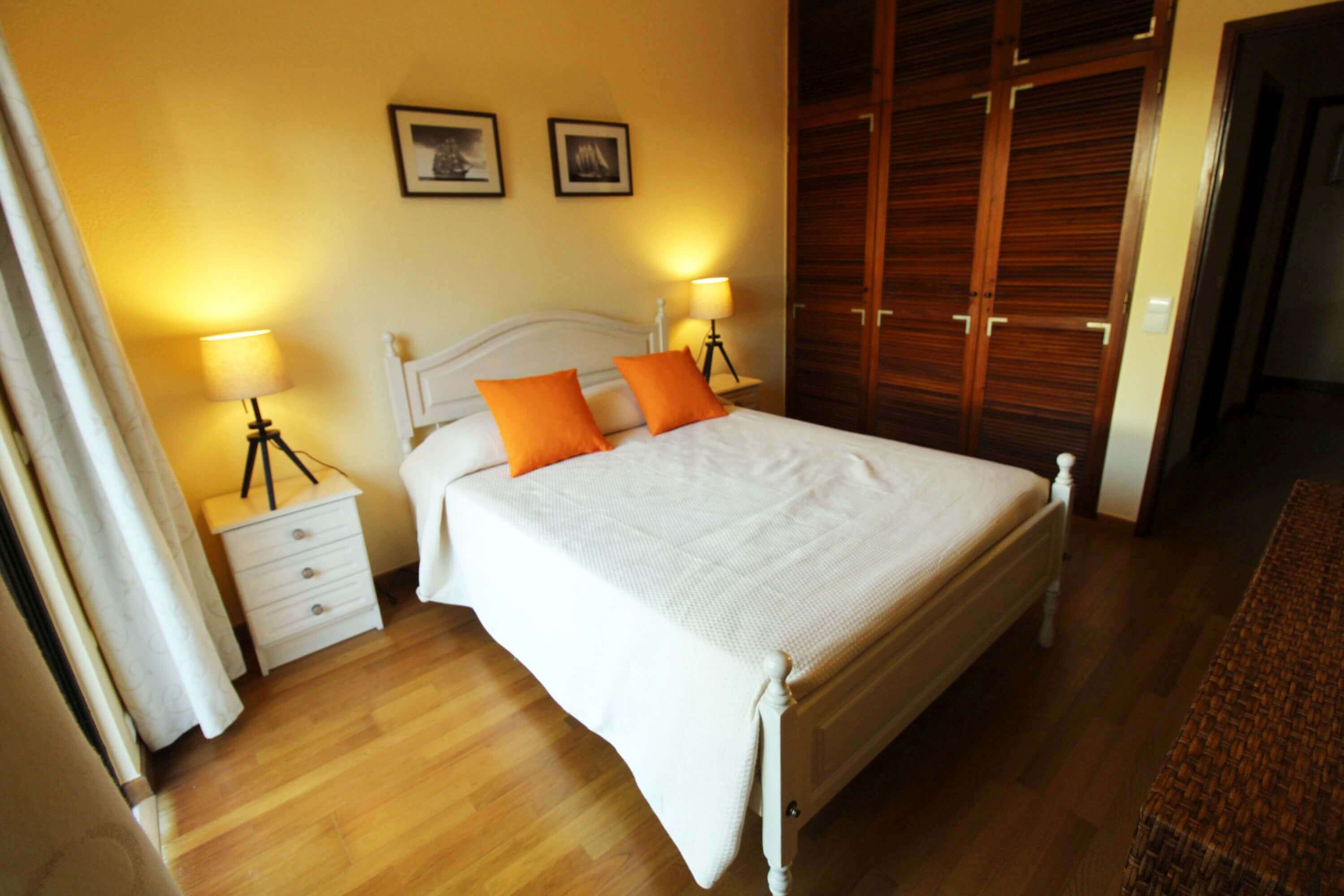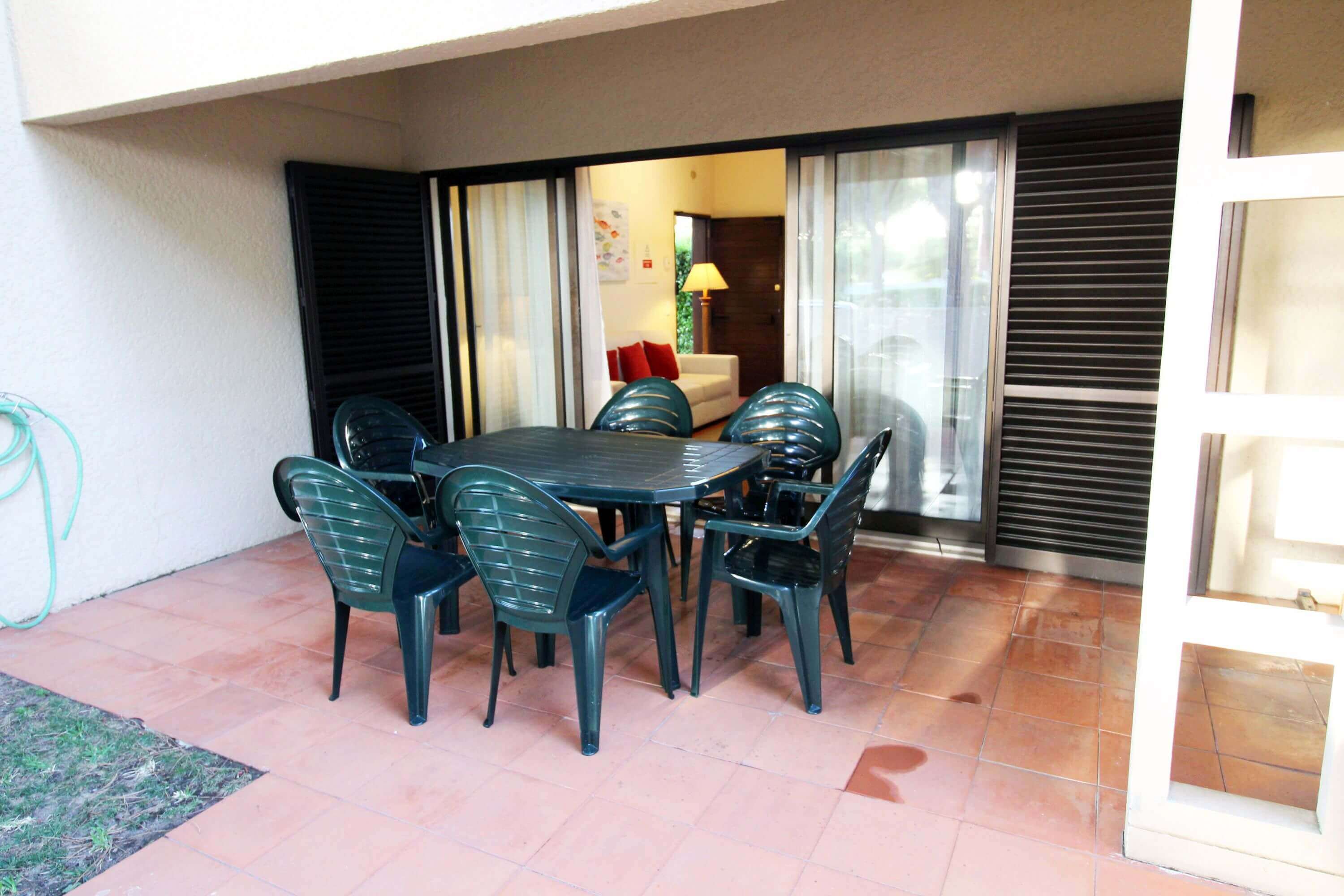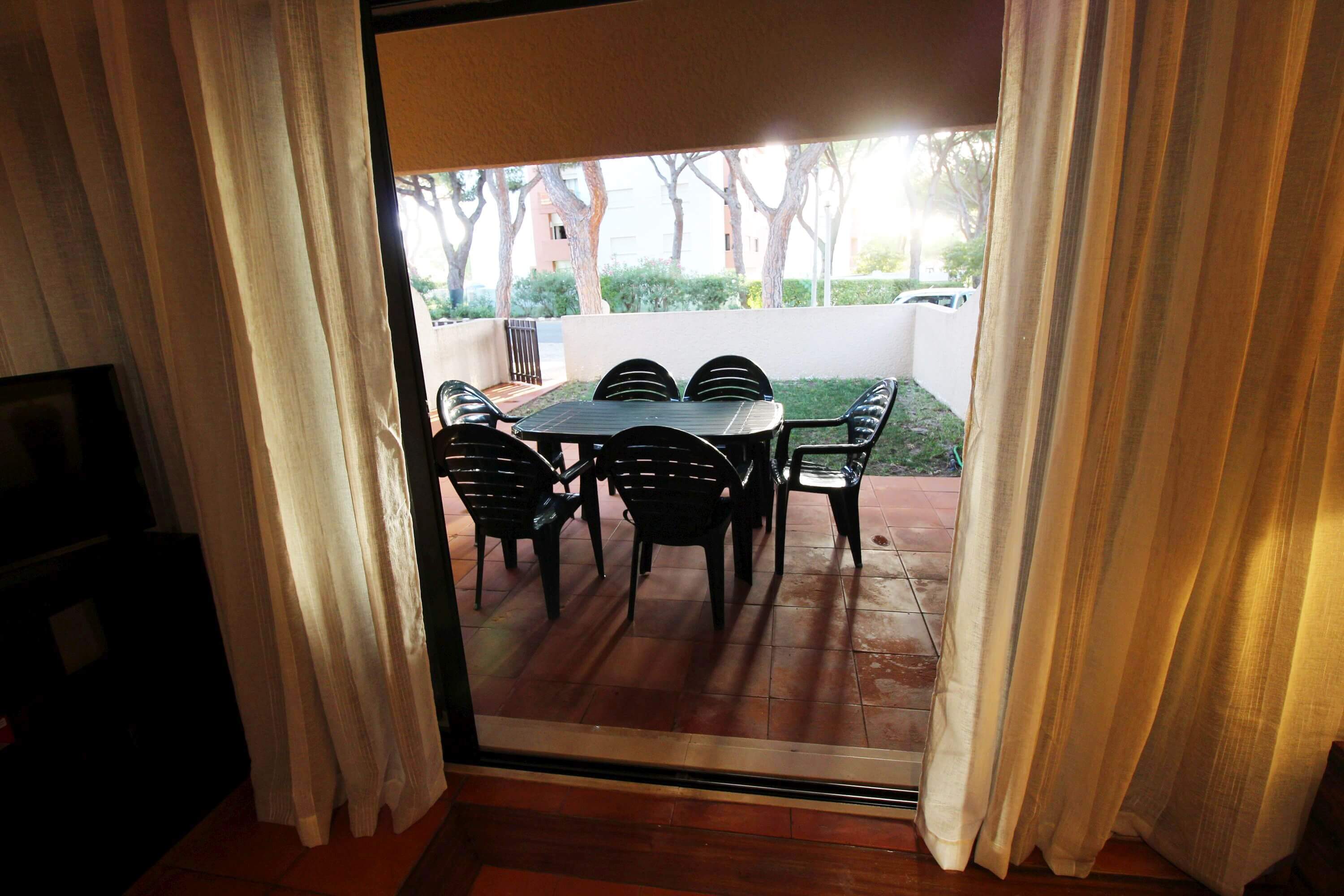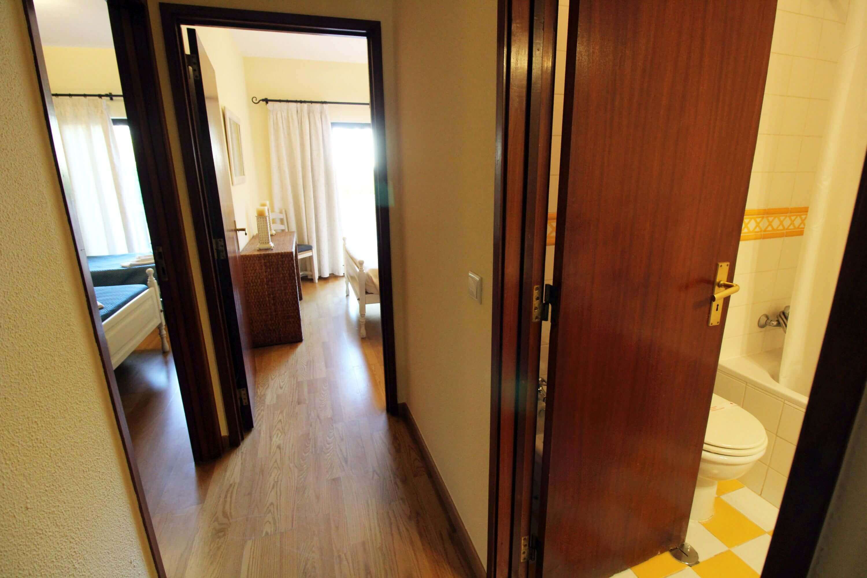 There's one bedroom with 2 single beds, and another bedroom with a double bed, both with direct access to a patio, which gives access to the communal pool. There's a bathroom with a shower available.
