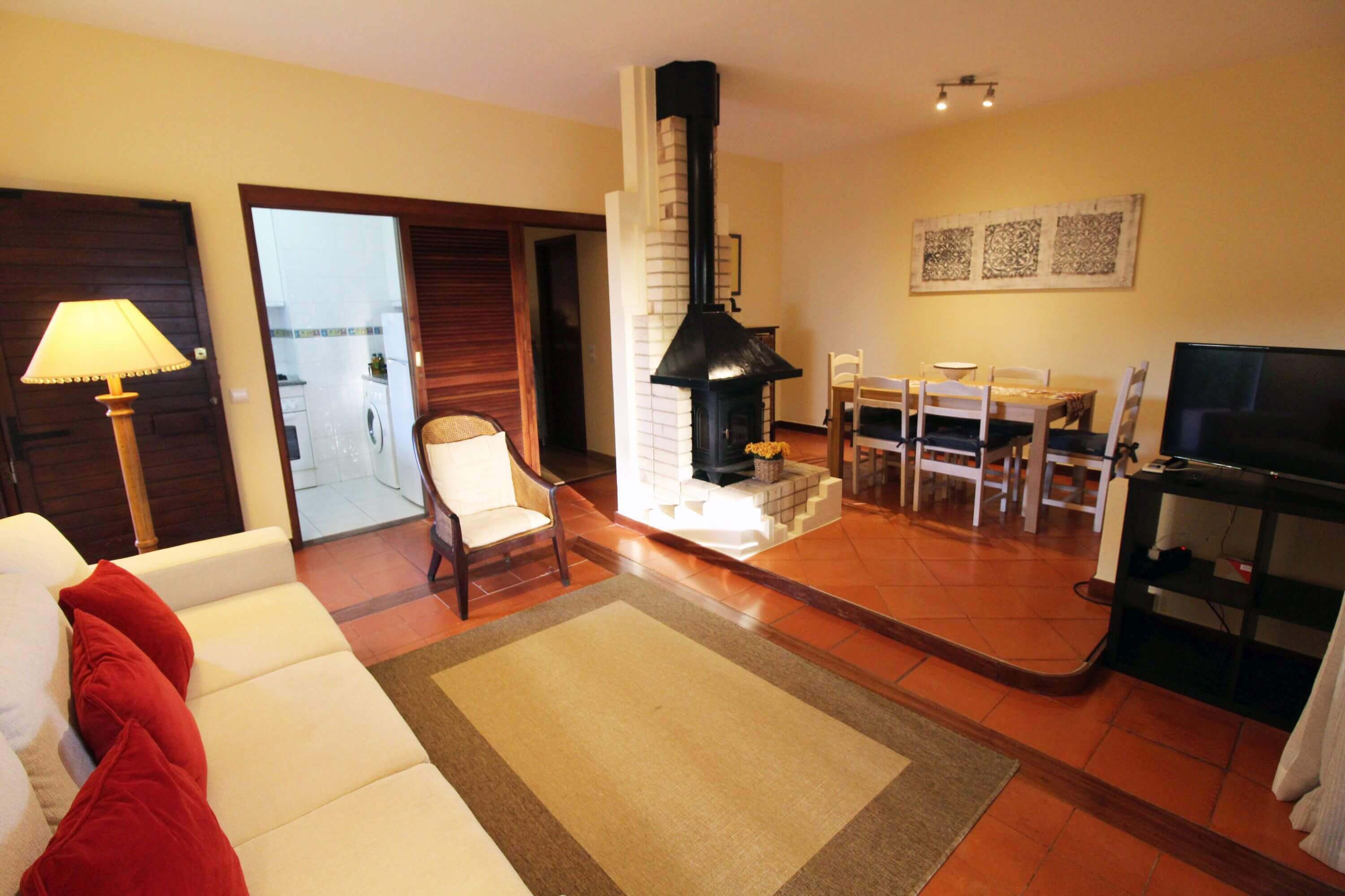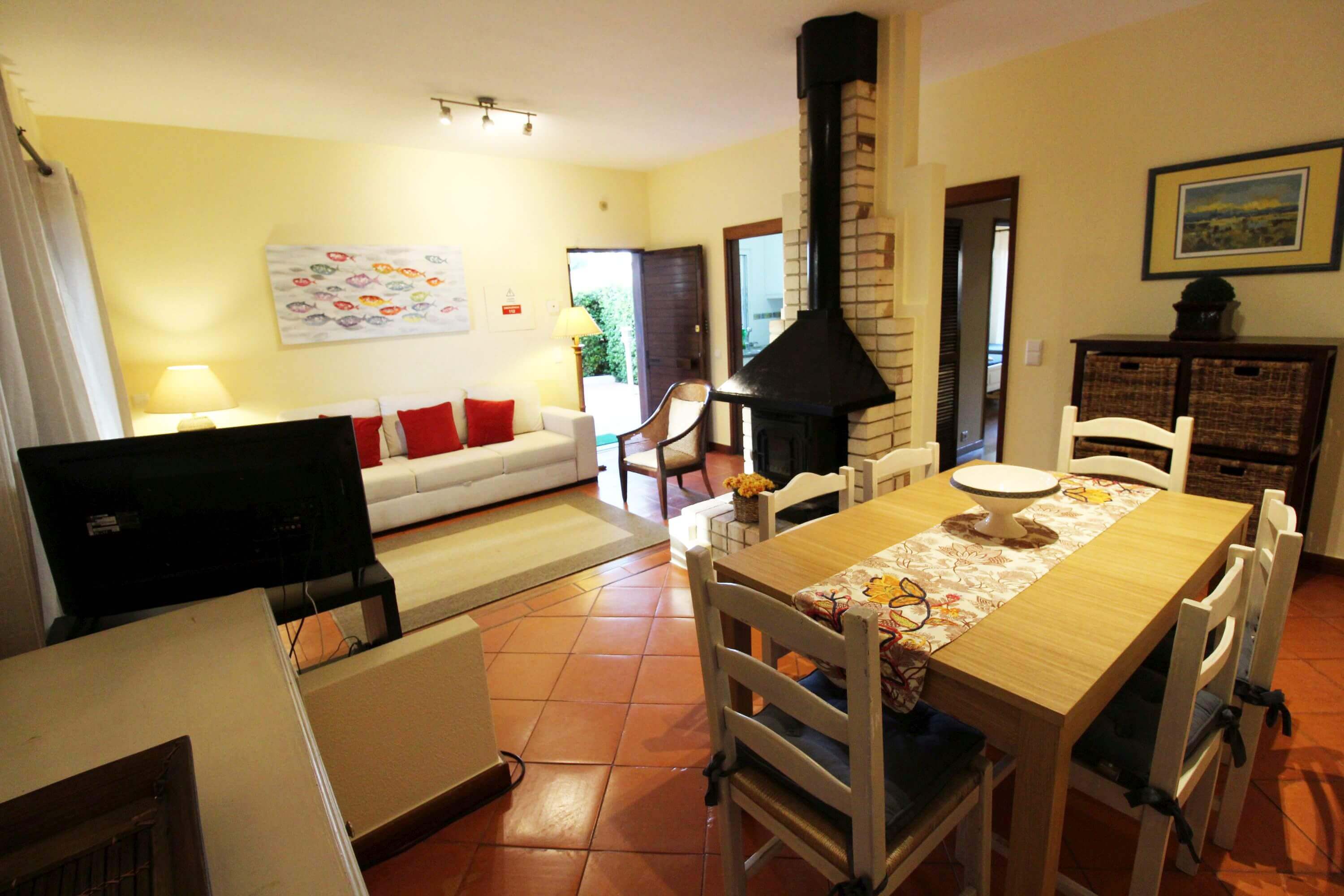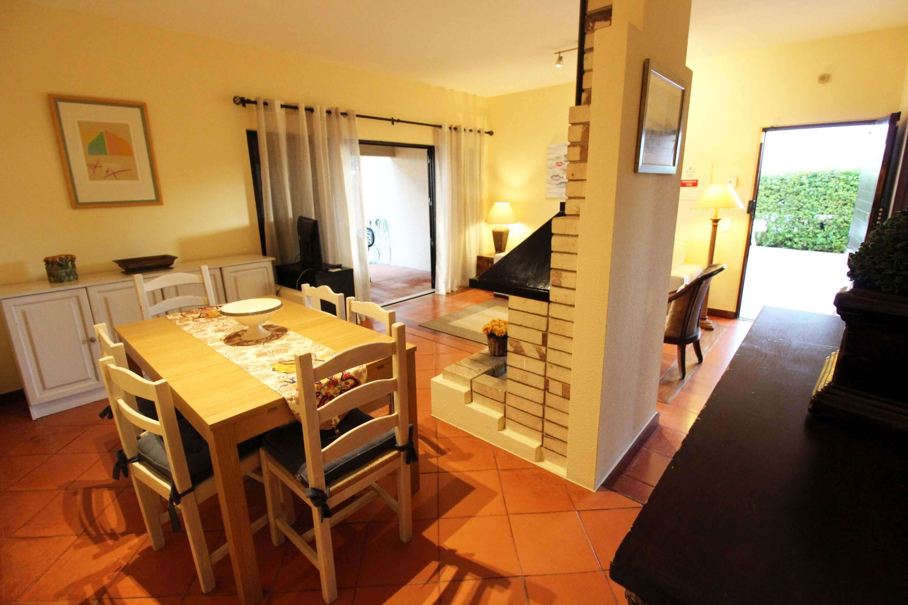 The apartment has a living room with dining table for 6 people, TV, wifi, fireplace, double sofa bed and leads to a patio where you'll find outdoor furniture for outdoor dining.
