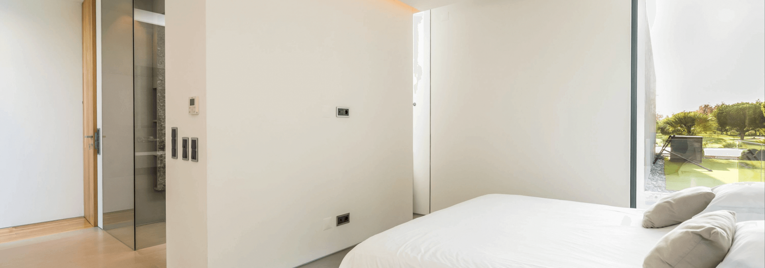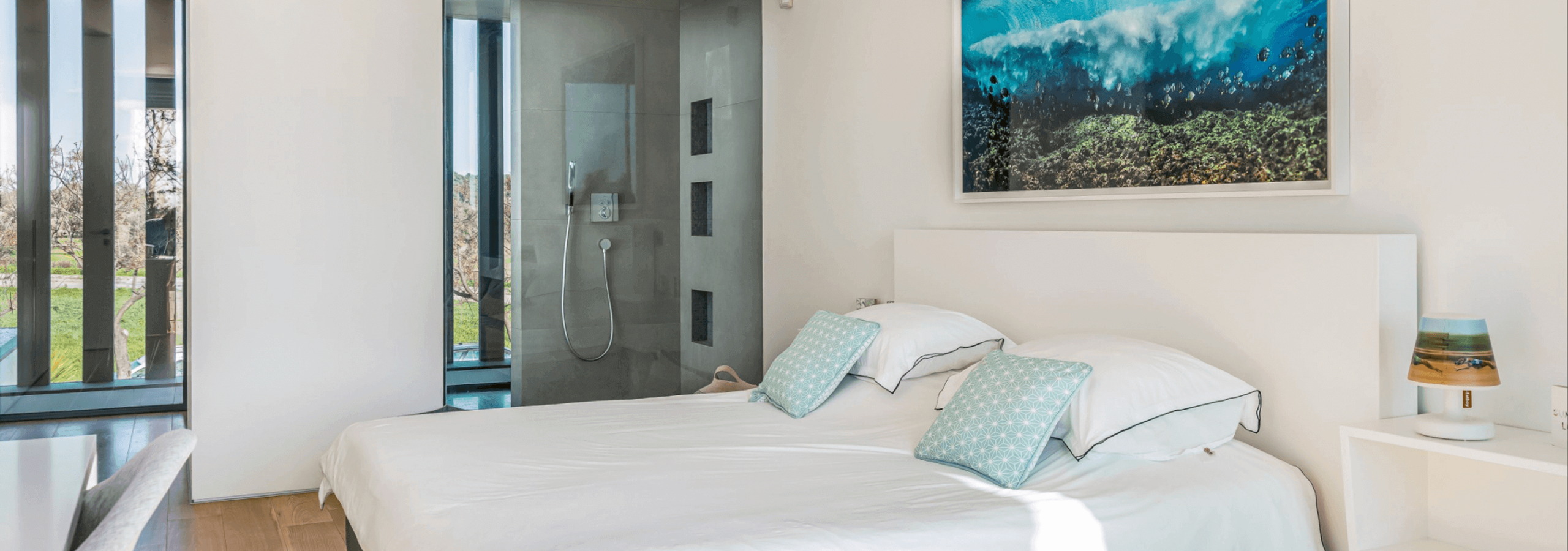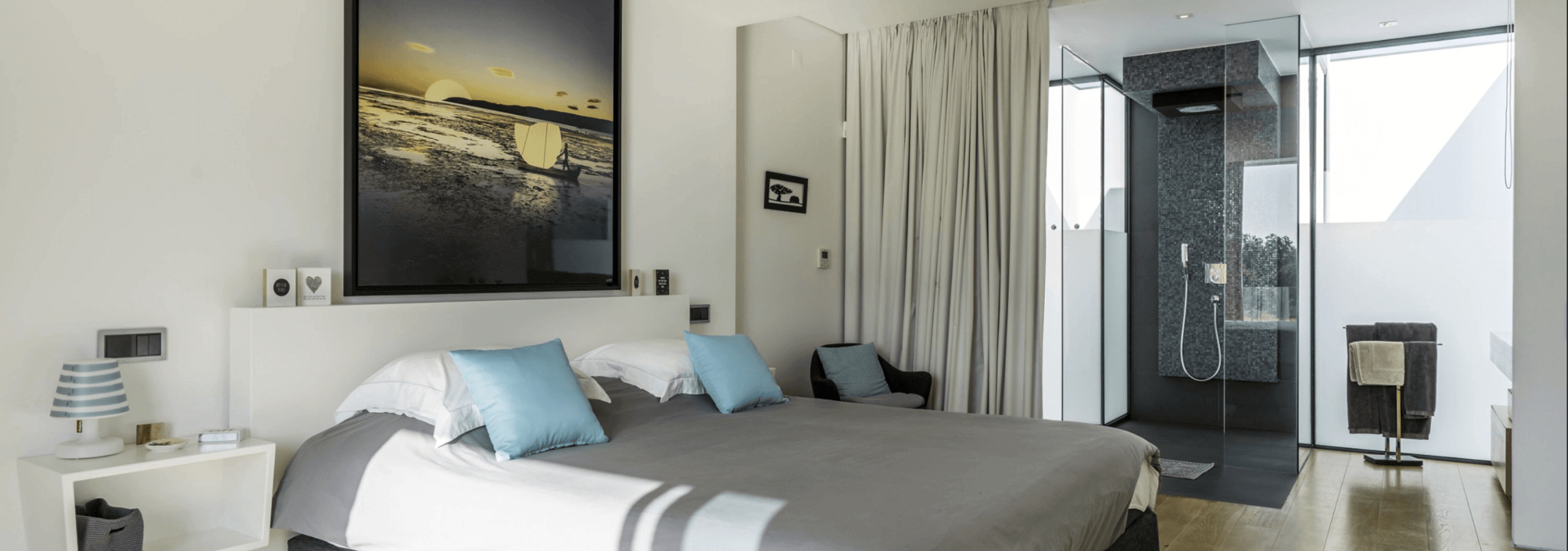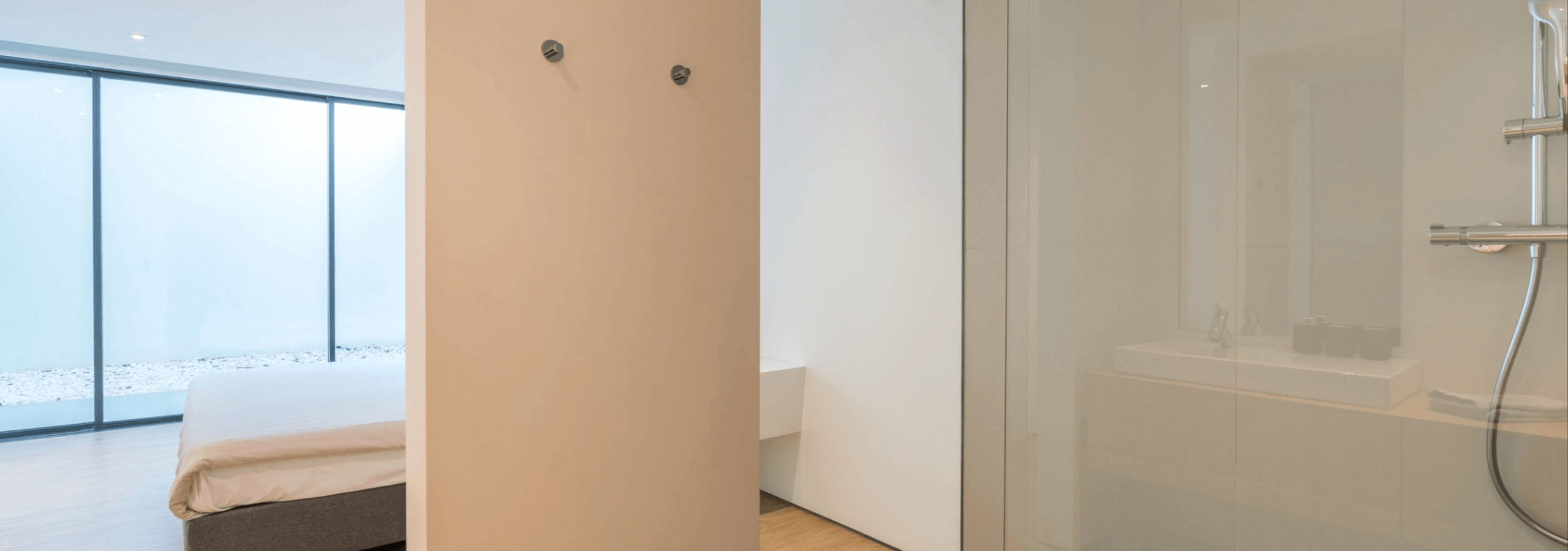 All rooms have a special feature; all shower areas have a glass wall, facing the interior of the room.