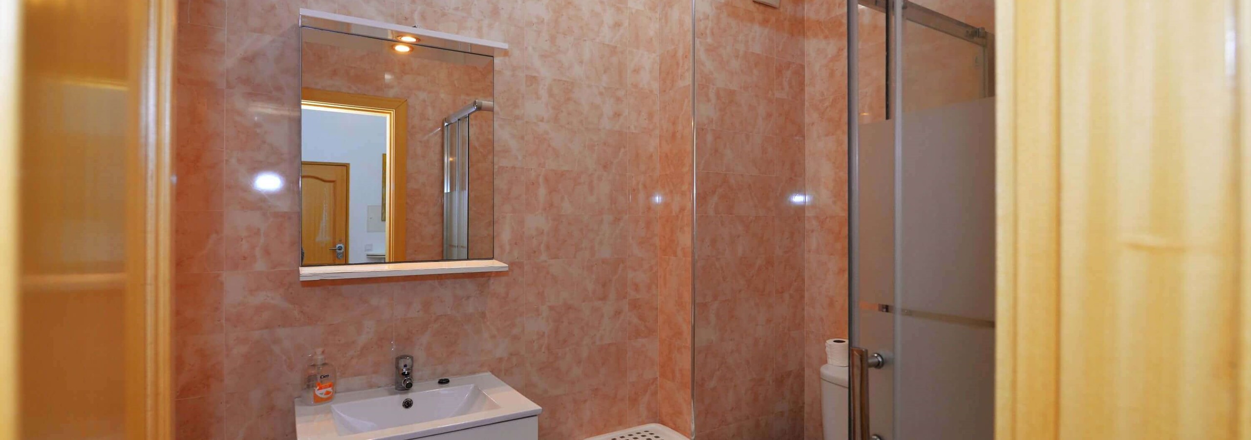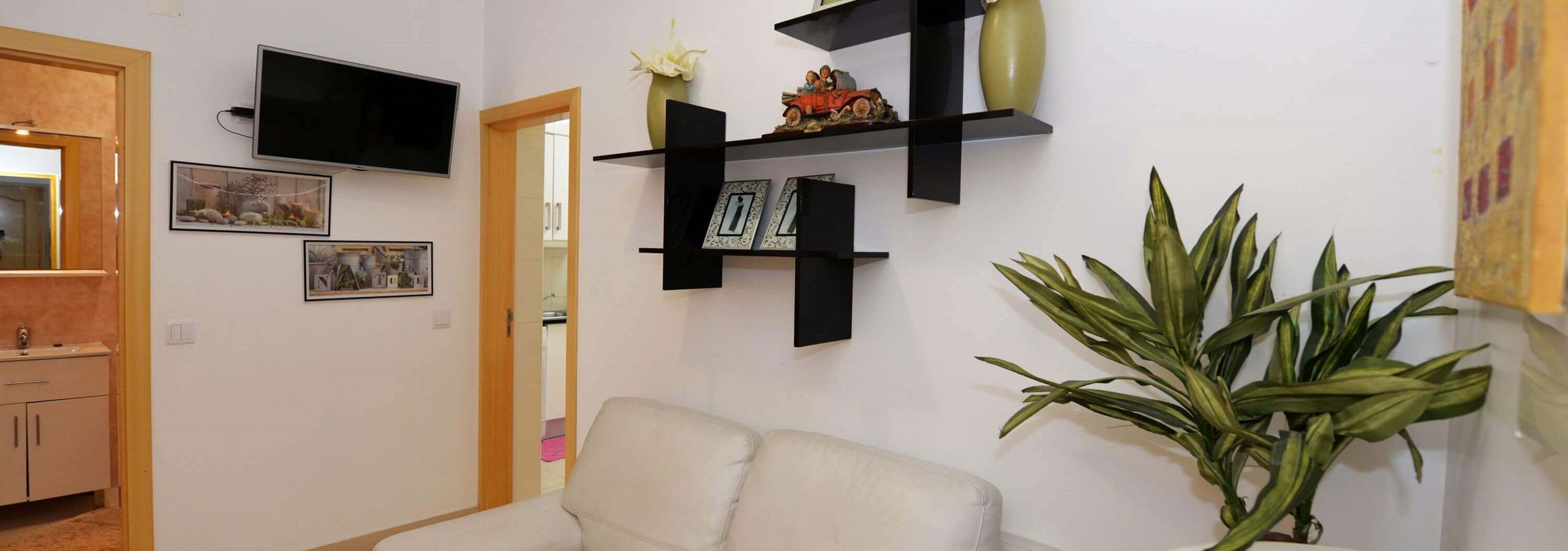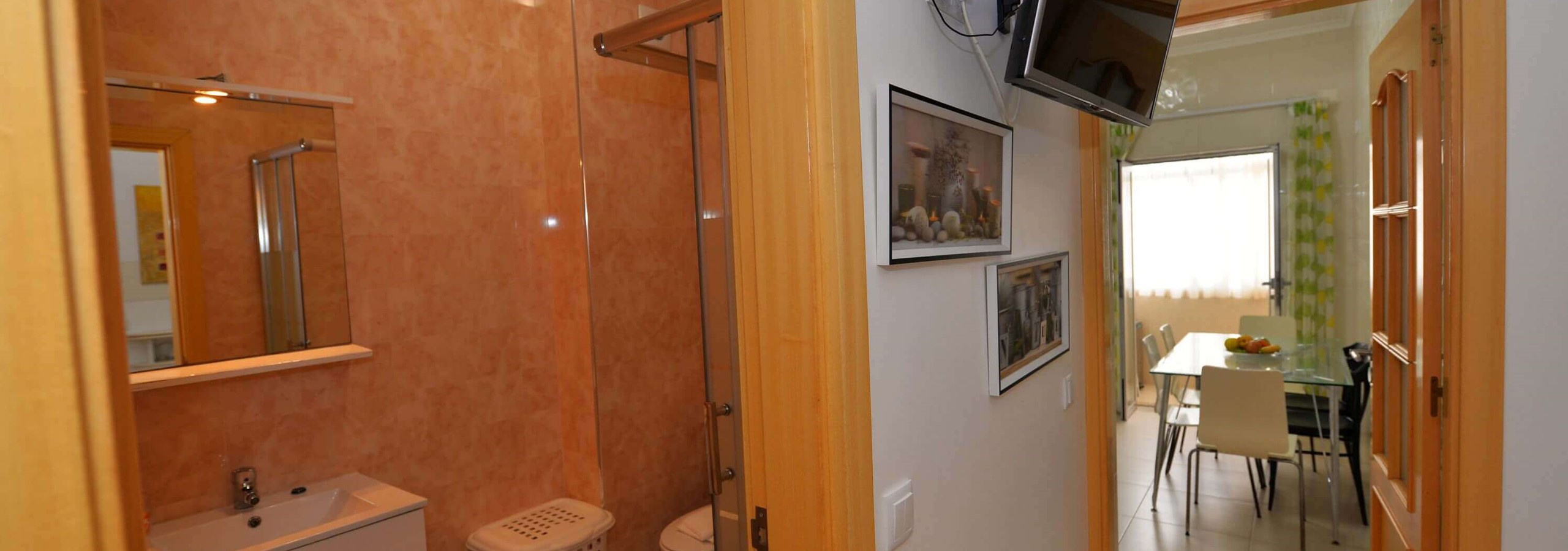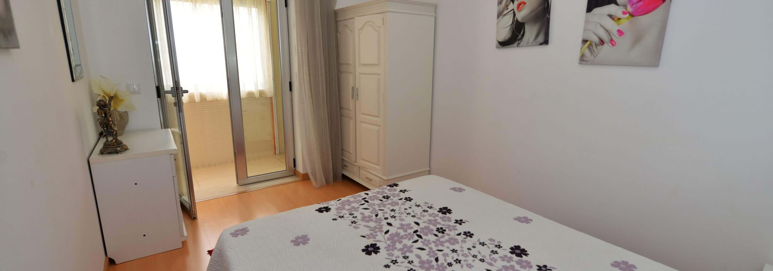 The apartment features 2 bathrooms, and each of the 3 bedrooms are quite comfortable, promising a restful night's sleep. The small balcony, accessible via two of the bedrooms, has a small table with two chairs, and offers partial sea views, perfect for enjoying your morning coffee.
