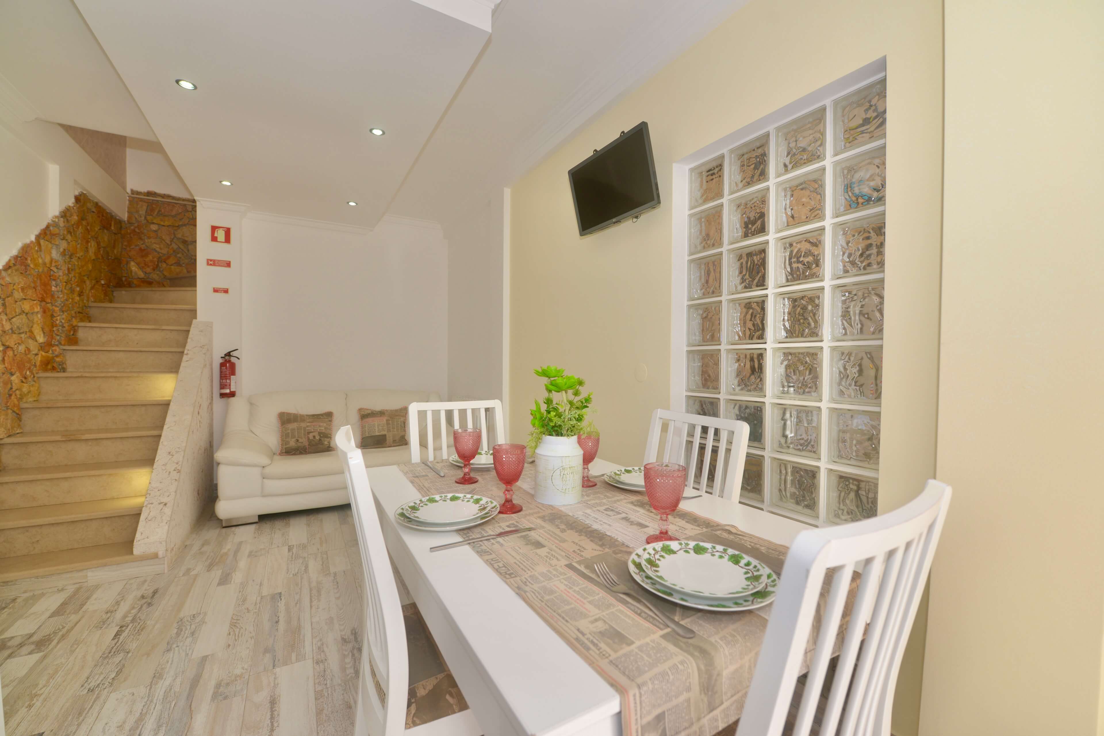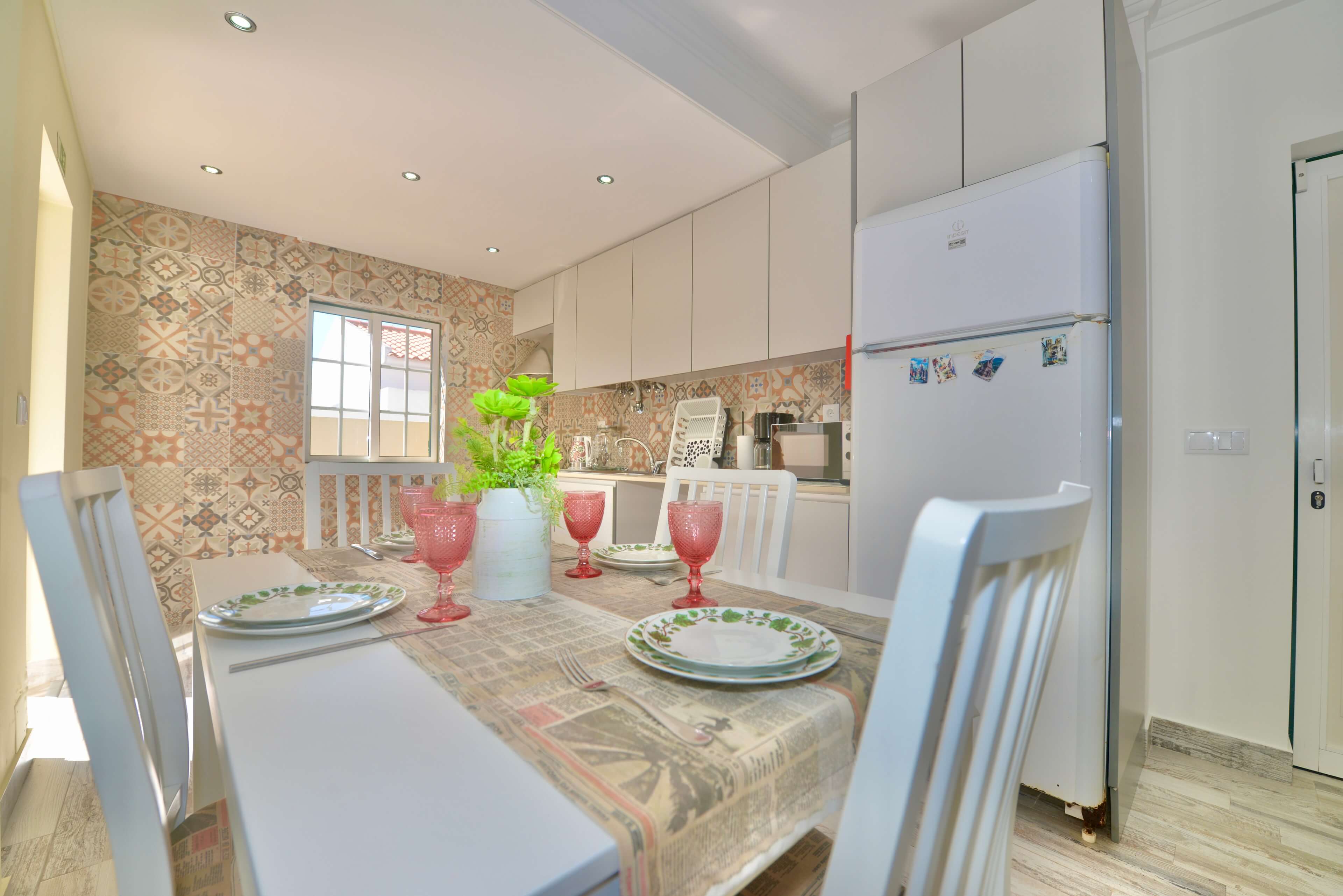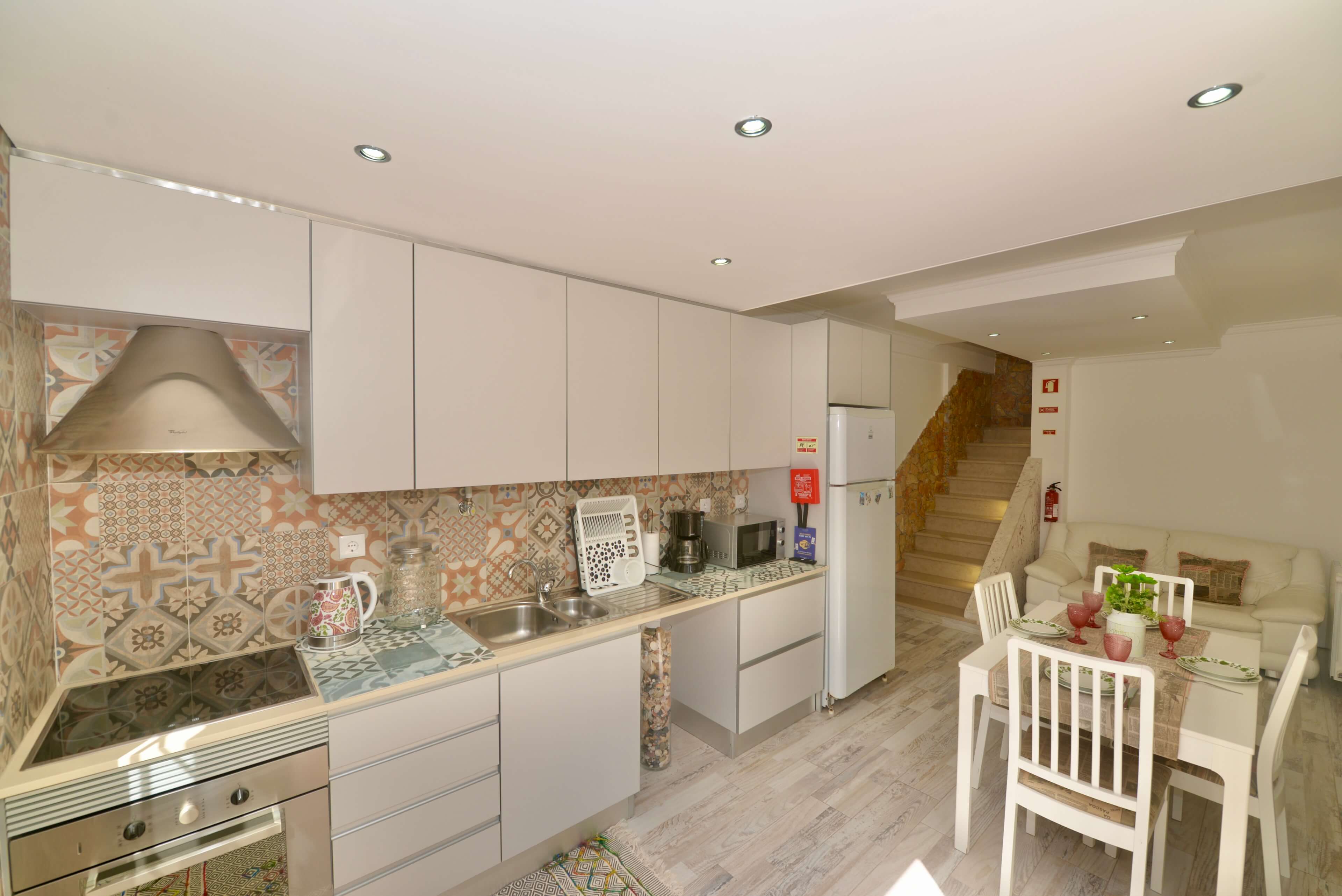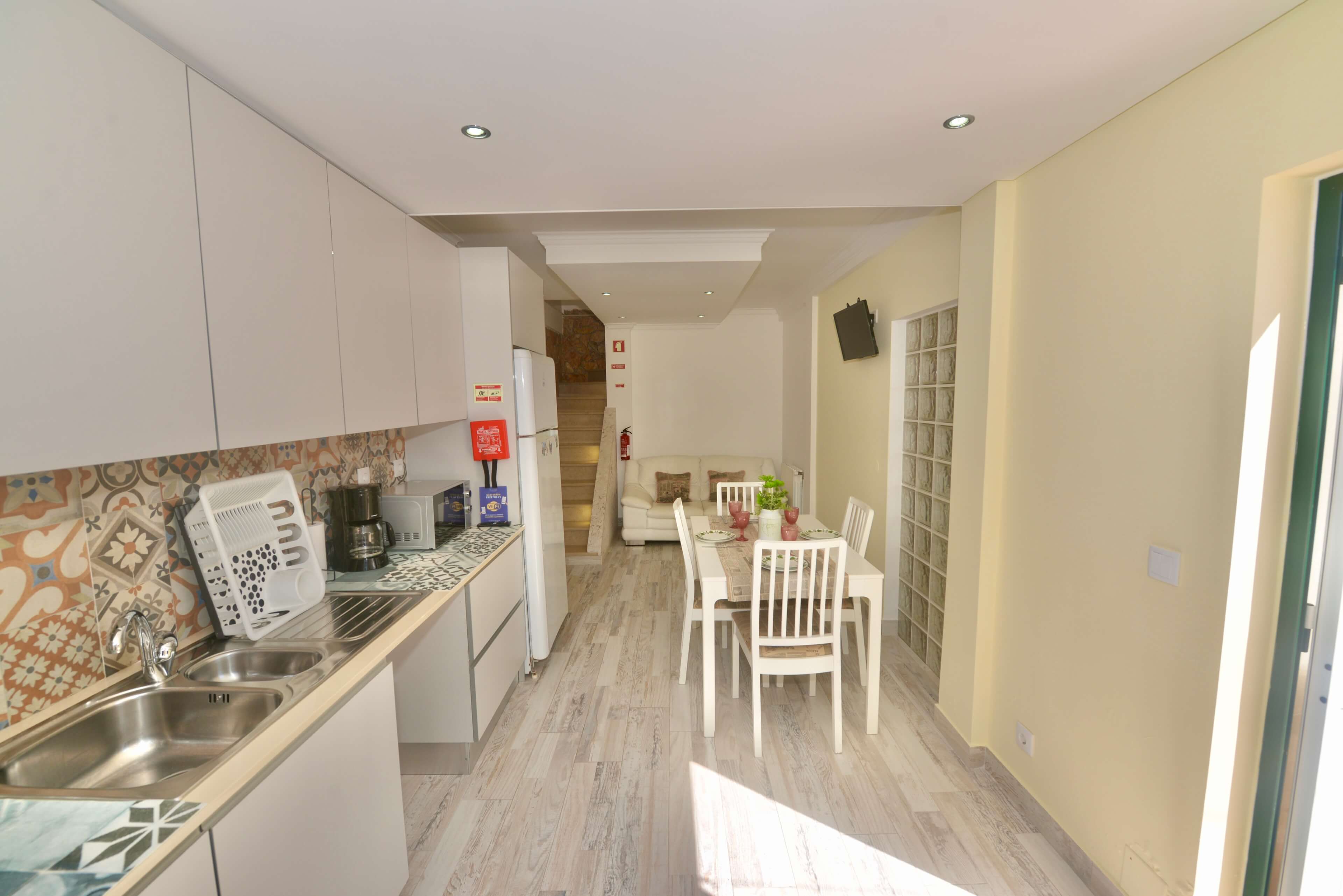 On the ground floor, guests will find a bright living area connected to a fully equipped kitchen, creating a comfortable space to cook, dine and unwind after a day exploring Nazaré.