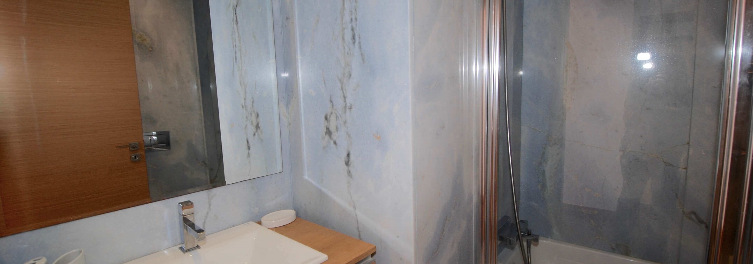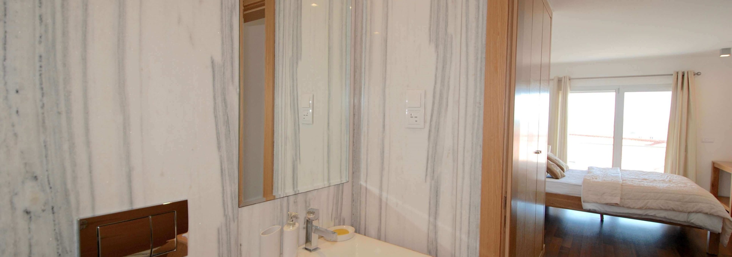 The second bedroom (again with a balcony) has a King sized bed and again its own en-suite bathroom with WC, bath and shower cubicle.