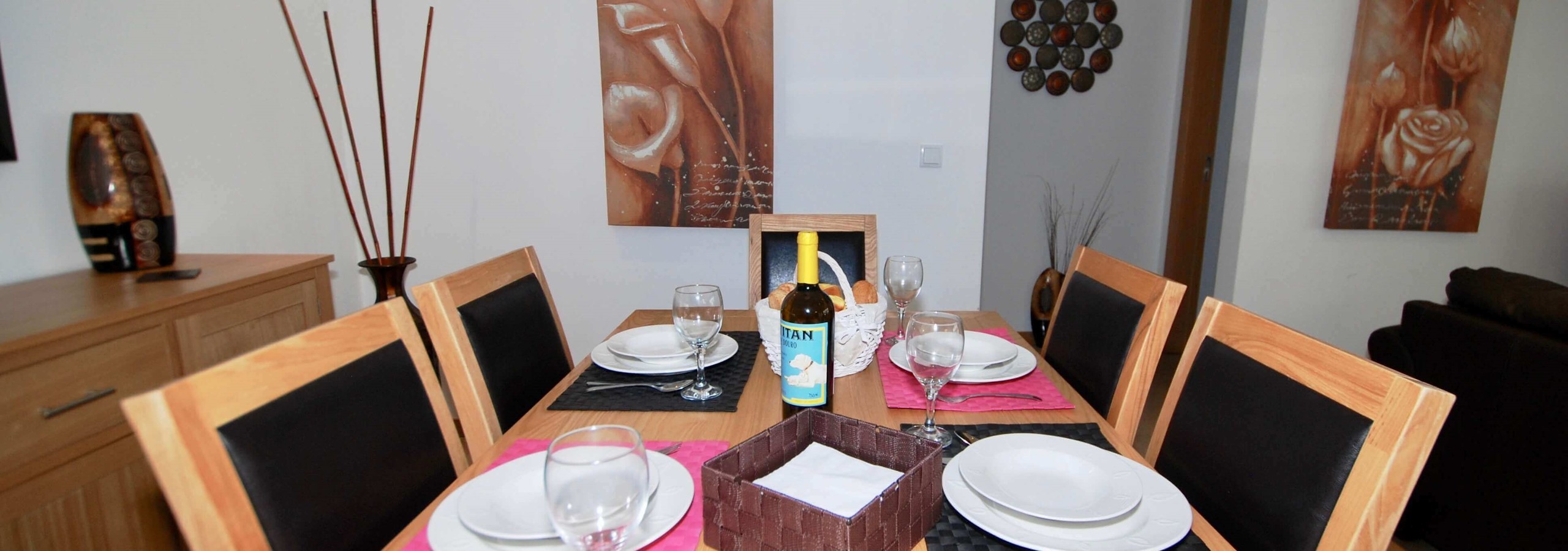 The open plan living space with lounge, kitchen and dining area is spacious and great for nice moments of entertaining between family and friends, where everyone can be involved. This area opens to a large balcony with dining area which is great for enjoying the nice weather. The kitchen is of a generous size and is equipped with everything you might need for cooking at home. The lounge area is comfortable and comes with a TV, with a small selection of cable channels, DVD player and a mobile broadband device, providing a basic wifi service.