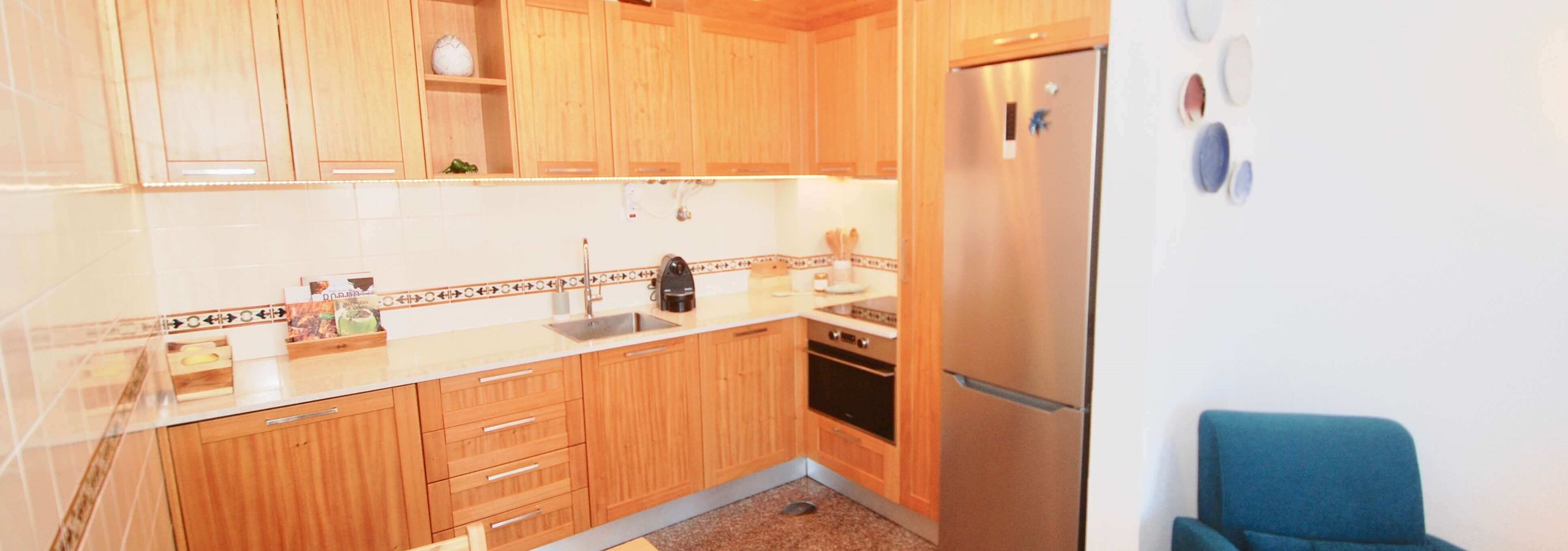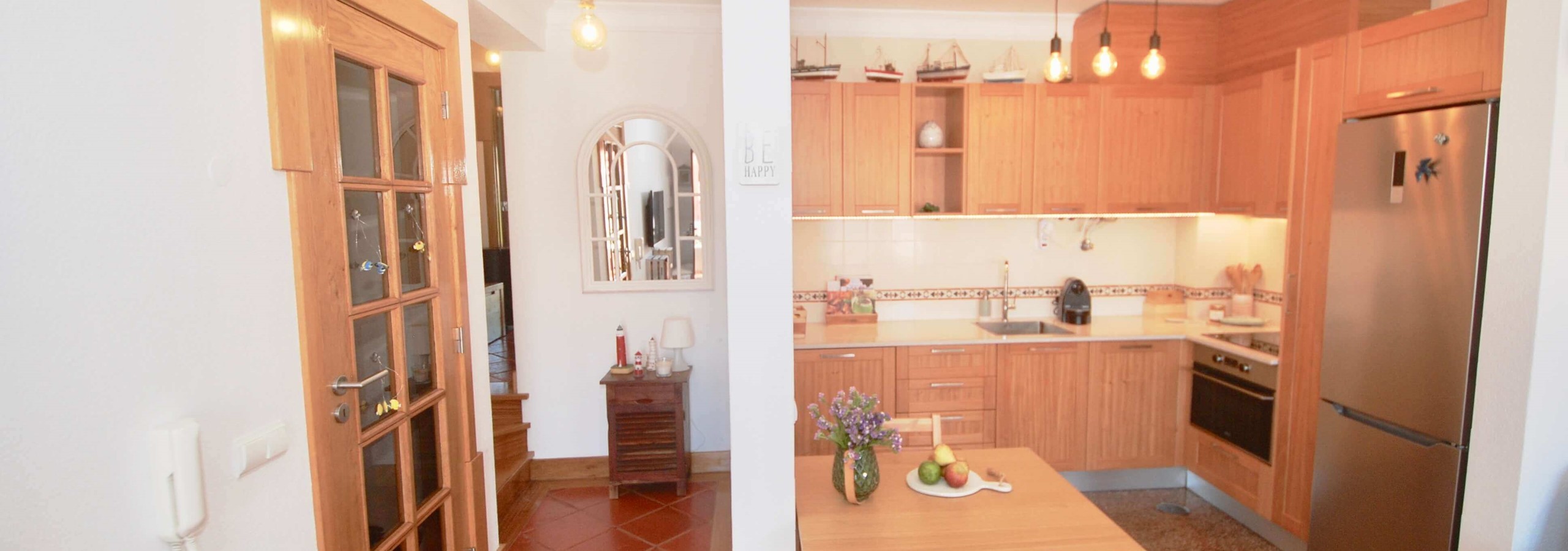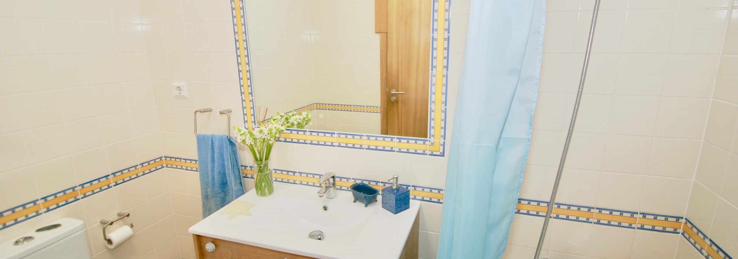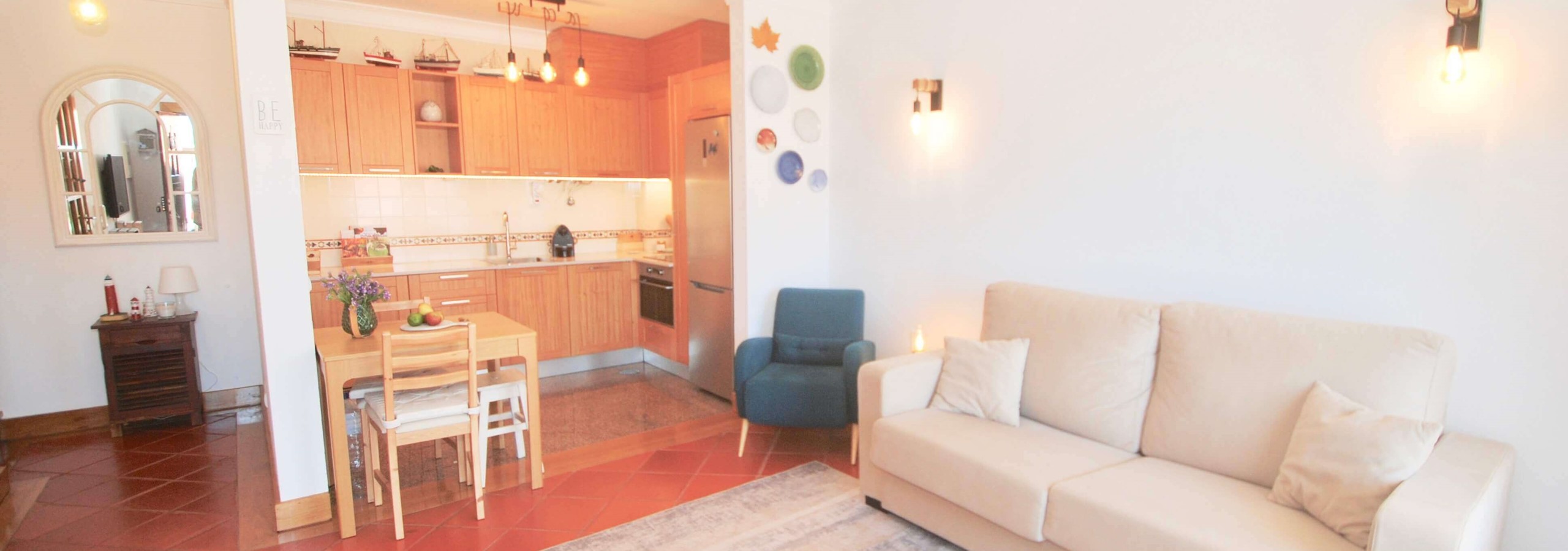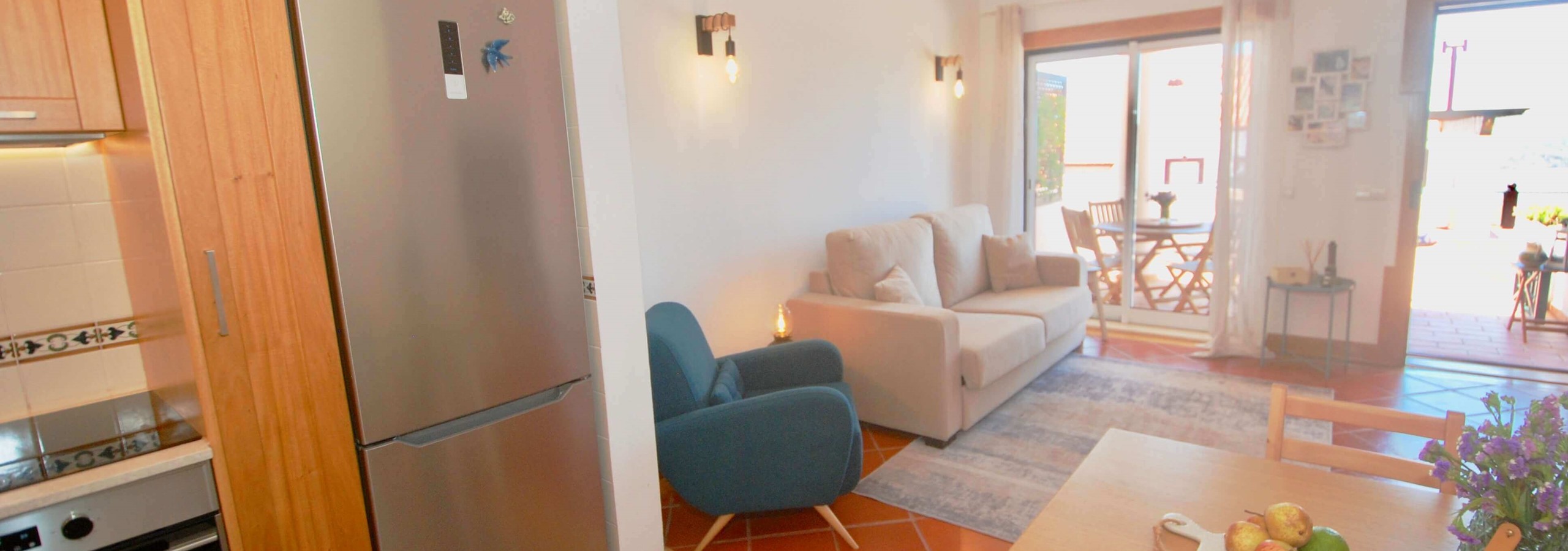 Inside, the property is practical and stylish, offering all the comforts of a home. The open plan living area is composed of a very well equipped kitchen with dining area and a comfortable lounge with cable TV, free Wi-Fi and a bluetooth speaker which you can use with your phone. This area opens up to the main terrace where you can enjoy dining outside or simply relax under the sun. The owner has kindly provided 2 sun loungers which you can use in your private terrace, in the communal gardens or take them with you to one of the 3 pools of the complex.