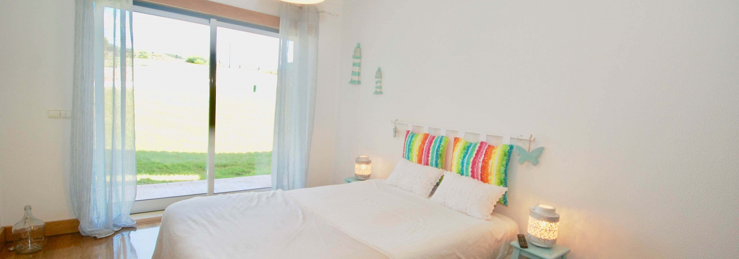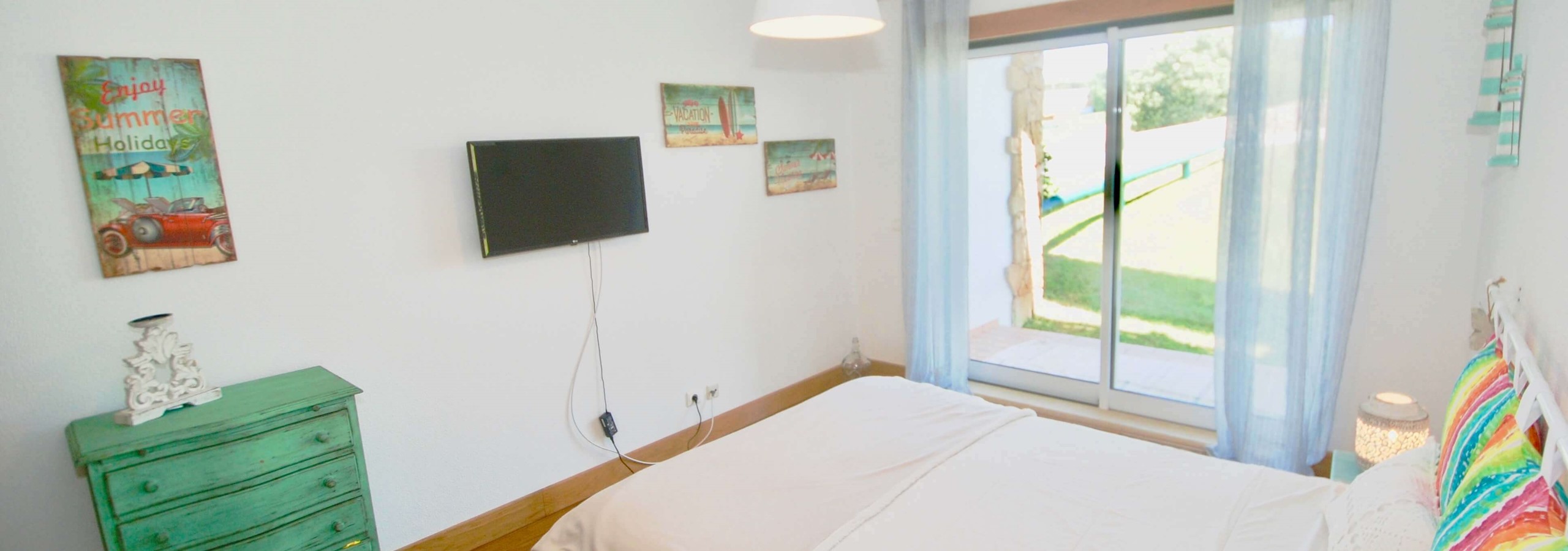 The bedroom is spacious with a double bed and built-in closet. From the bedroom, you can access the second private terrace which extends in to the vast communal gardens of the complex. There is a double sofa-bed in the lounge that can be used to accommodate the 2 other guests.