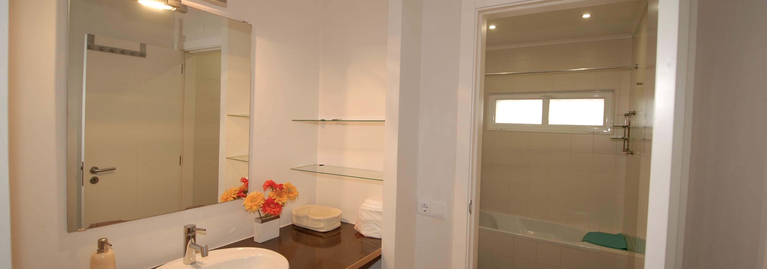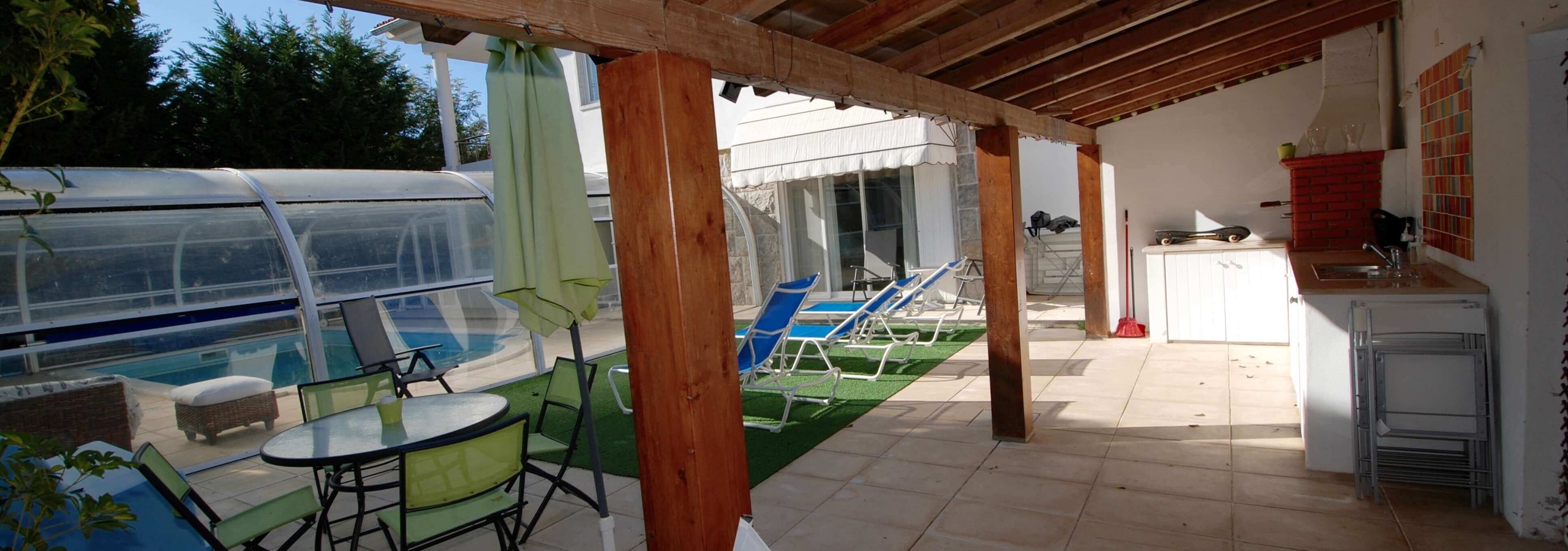 Outside, in the lovely terrace, besides the amazing and large covered private pool, you'll find sun loungers and chairs, an outdoor dining table, an outdoor kitchen area with BBQ and even a bathroom for your use when outside. The whole exterior area and pool is for exclusive use of guests on the ground-floor.