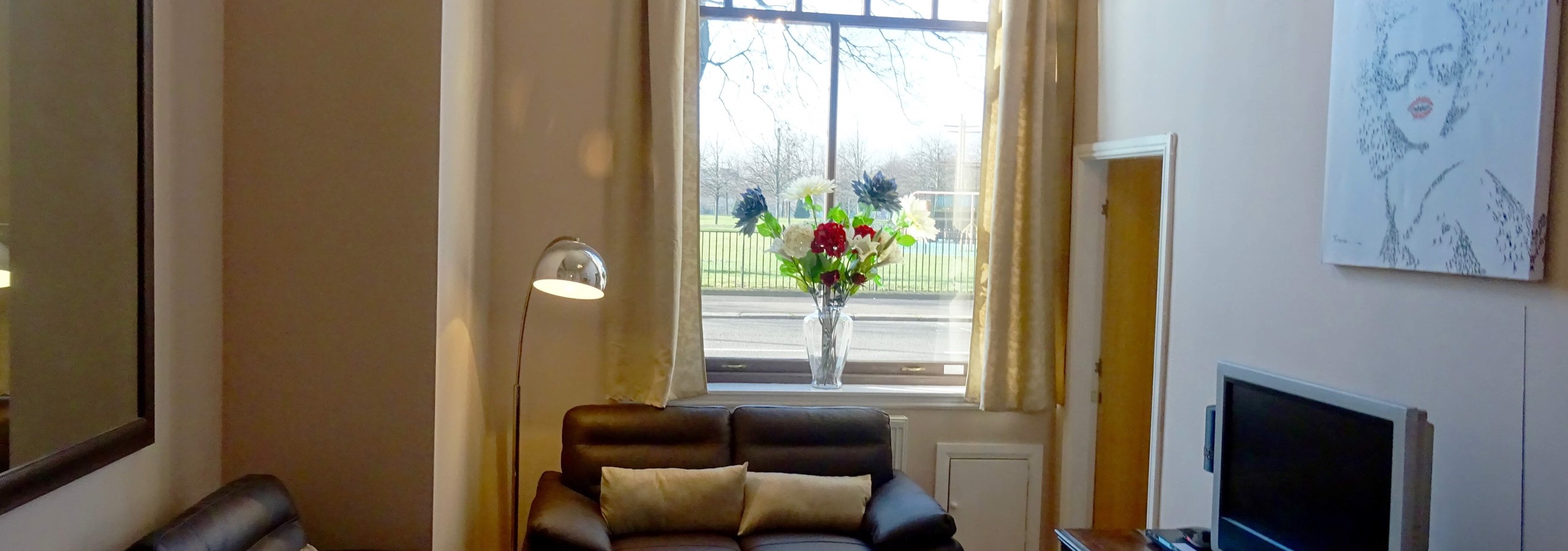 The lounge and master bedroom have double height feature windows overlooking the park which are characteristic of the era in Glasgow. And there are beautiful tall ceilings throughout the apartment with a feature pillar and beam in the lounge. The building is iconic in Glasgow.