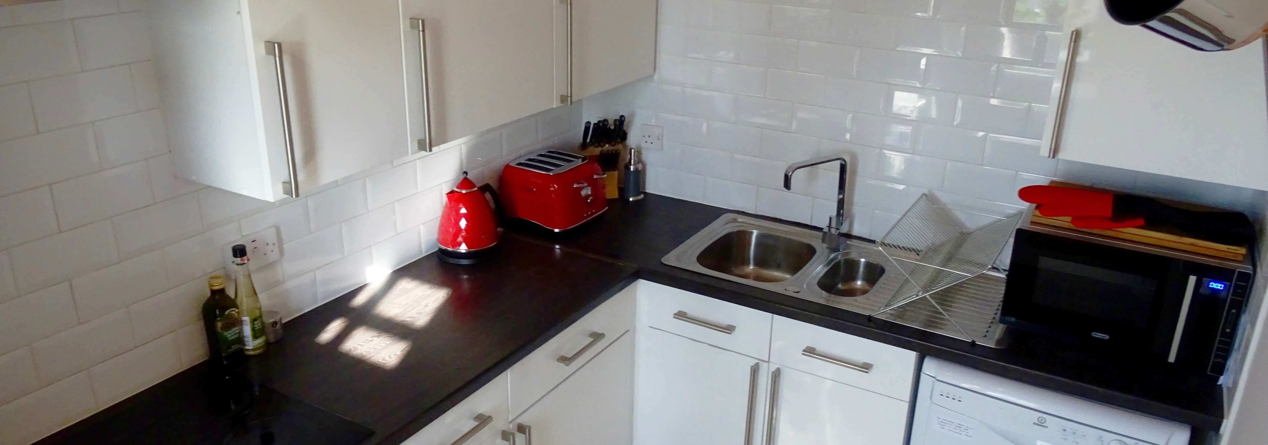 The kitchen is fully equipped with everything you need including pantry items which are free for you to use. There is also a dishwasher, microwave and washing machine. The hallway houses a pulley up hanging rail for drying clothes to keep them out of the way.
